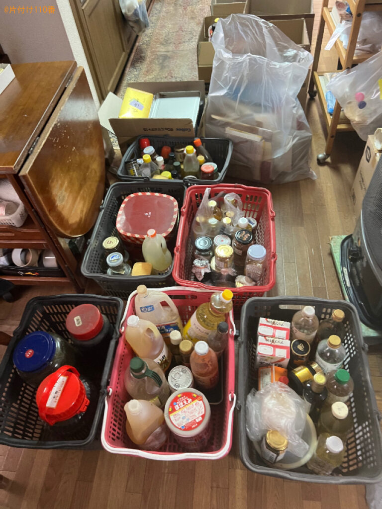 | 担当のコメント | 中身の入った瓶やペットボトル、一般ごみ等の処理にお困りのお客様からご相談いただきました。見積り額がご予算内だったことがご依頼の決め手になったようです。片付け110番では、中身が入ったものも回収させていただきます。不用品にお困りの際はまたいつでもご相談ください。 |